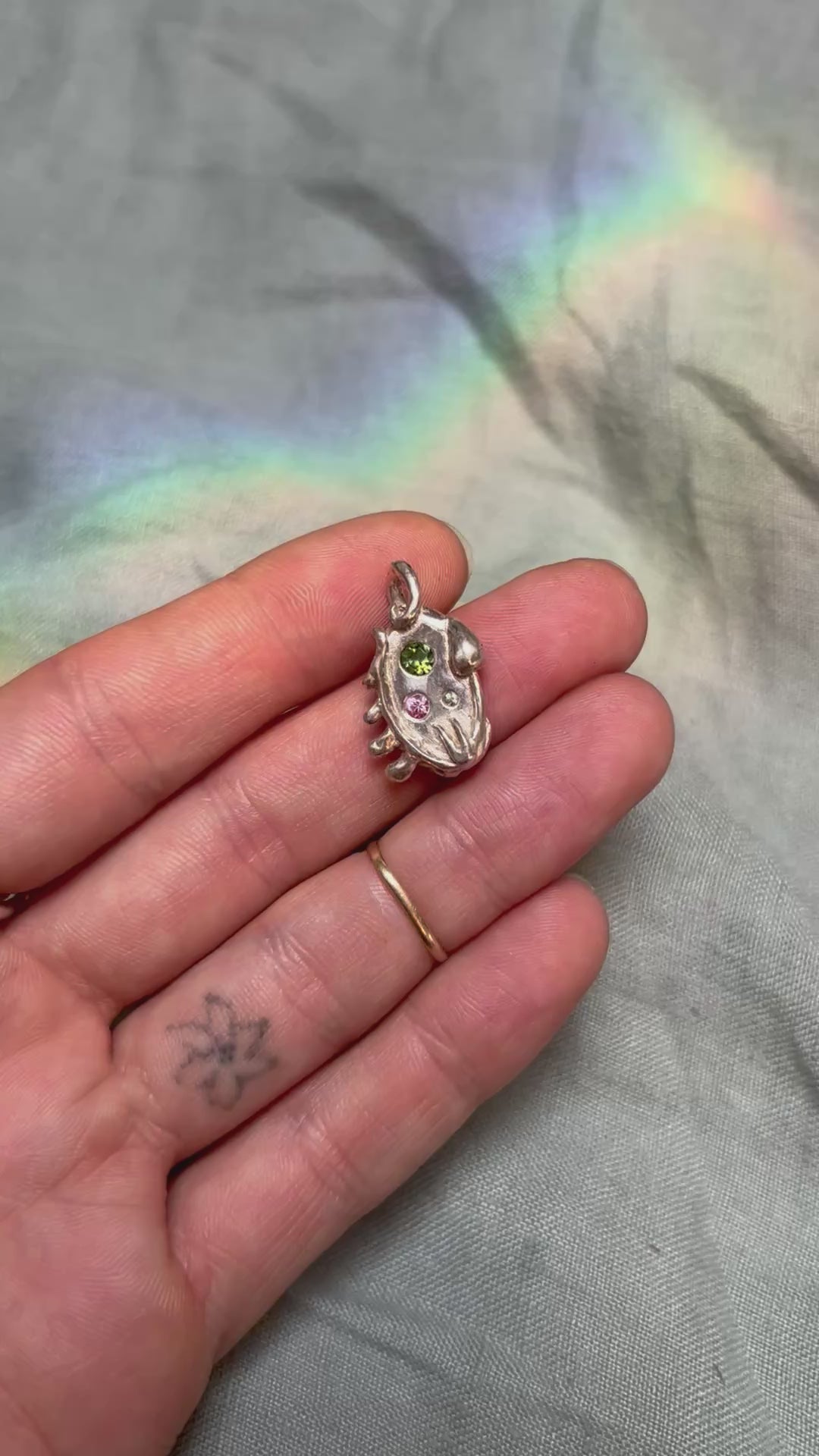 This pendant hosts green and pink sapphires and a big green juicy tourmaline, set in silver with a little liberty cap and foxgloves framing them and sneaky vines that holds the pendant on it’s chain.